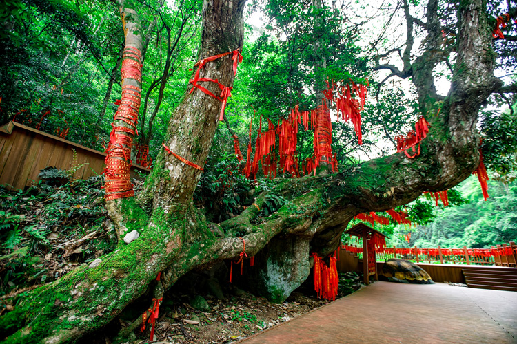 树抱石景区位于珠帘瀑布下行1公里处,因一棵千年古树紧紧抱住一方巨石而得名。据专家测定,这是一棵野生钩栲树,树龄高达1500多年,因其根部并排衍生着大小相等的两棵子树,直冲云霄,当地人又称它为“龙母生双子”。